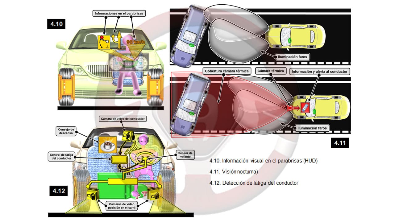 - Para aportar la información que considera útil el conductor, sin que aparte la vista de la carretera se proyecta la información seleccionada o de emergencia sobre el interior del parabrisas, delante de los ojos del conductor.