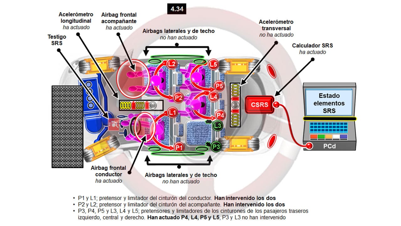 - Pretensores (P1, P2, P3 y P4), limitadores (L1, L2, L3 y L4), airbag de conductor y pasajero, así como los de rodillas de las plazas delanteras si los lleva y los de los cinturones en las plazas traseras ocupadas si cuenta con estos.
