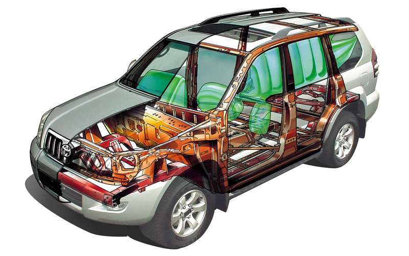 - Estructura de carrocería por bastidor independiente acoplado al monocasco, buena resistencia en uso todoterreno y más peso con menos capacidad de deformación
